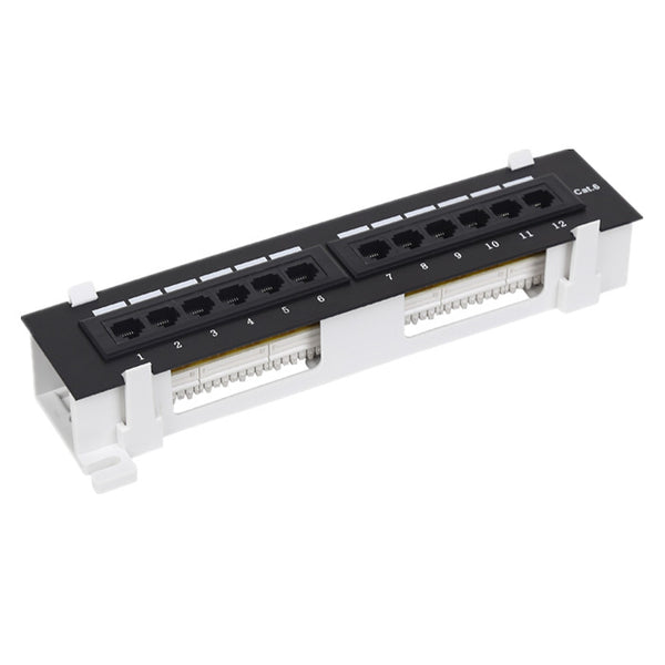 CAT6 mini 12 port patch panel is a compact network equipment used to terminate and organize Cat6 Ethernet cables in a structured cabling system. It is typically mounted on a wall or in a network rack, and provides a centralized point for connecting Ethernet cables from different devices such as computers, switches, routers, and servers.